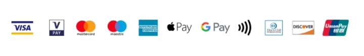 We accept: Visa, V PAY, Mastercard, Maestro, American Express, Discover, Diners Club, China Union Pay. Payments are securely processed through SumUp or Stripe.
